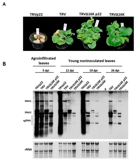 Analysis of Nicotiana benthamiana plants inoculated with Tobacco rattle virus (TRV) expressing Tomato chlorosis virus p22 (TRVp22), TRV, TRV∆16Kp22, and TRV∆16K. (A) Symptoms on N. benthamiana following inoculation with TRVp22, TRV, TRV∆16Kp22, and TRV∆16K at 19 days post-inoculation; (B) Northern blot analysis of RNA extracted from agroinfiltrated patches at five days post-infiltration (dpi) and from non-inoculated leaves at 12, 19, and 26 dpi of the same plants. Hybridization was carried out with a probe specific to the 3′untranslatable region that is identical in RNA1 and RNA2 of TRV. Positions of TRV genomic RNA1 and RNA2 and subgenomic RNAs (sgRNA) are indicated. Note that RNA2 was longer in TRVp22 and TRV∆16Kp22 because of the insertion of the p22 gene sequence. X indicates no RNA sample since plants agroinfiltrated with TRVp22 were dead at 26 dpi, and—is a healthy negative control. Ethidium bromide staining of rRNA was used as a loading control.