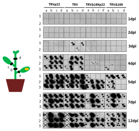 We examined whether the rapid spread of the necrotic symptoms observed in plants infected with TRVp22 was linked to faster systemic spread of the virus. Tissue blot analysis was performed for cross-sections of non-inoculated tissues in four different locations of the plants (Figure 3, left) co-infiltrated with a mixture of TRV1 plus TRV2p22 or TRV2, and TRV1∆16K plus TRV2p22 or TRV2 at 1, 2, 3, 4, 5, 7, and 12 dpi. As shown in Figure 3, the first positive signal in non-inoculated parts of the plant was observed for plants inoculated with wild type TRV at 3 dpi. By 4 dpi, complete systemic spread was observed in plants inoculated with either TRVp22 and wild type TRV. By this time, however, the systemic spread was less evident in most TRV∆16Kp22 or TRV∆16K-inoculated plants. By 5 dpi, in almost all cases, the mutant or wild type viruses had spread from the inoculated to the young non-inoculated parts of the plant, although the systemic spread was more evident at 7 and 12 dpi. Similar results were obtained in two independent experiments.