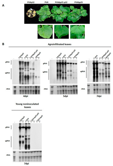 3.4. The Increased Virulence of the Recombinant Virus PVXp22 Is Not Linked to Faster Systemic Spread