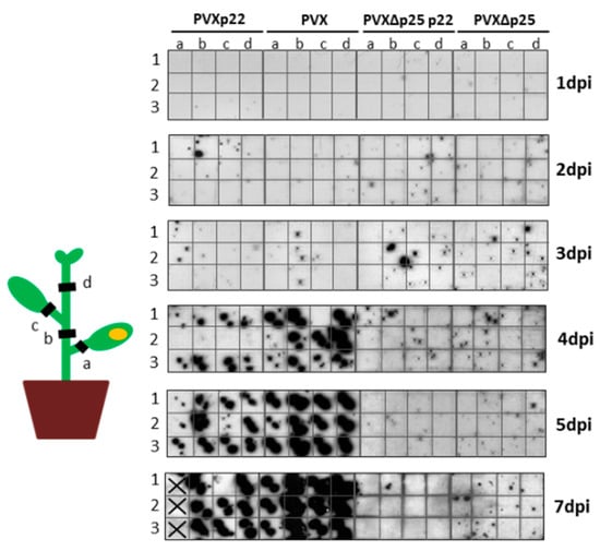 As described for TRV, we examined whether the rapid spread of the necrotic symptoms observed in plants infected with PVXp22 was linked to faster spread of the virus to non-inoculated parts of the plant by hybridization analysis of squash blots of stem or leaf petiole cross-sections of non-inoculated parts of the plant performed at 1, 2, 3, 4, 5, and 7 dpi (Figure 5). No differences were observed between PVXp22 and PVX indicating that the first clear positive signals of virus presence in the four sections of non-inoculated parts of the plants was observed at 4 dpi for both viruses. This positive signal was maintained in these two cases until 7 dpi, although the systemic necrosis shown by PVXp22-infected plants did not allow us to perform tissue blots of some cross-sections by 7 dpi. On the other hand, no positive signals in the non-inoculated parts of the plants were detected for PVX∆P25p22 or PVX∆P25 inoculations. Similar results were obtained from two independent experiments.