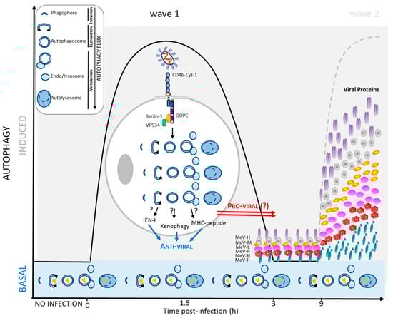 Many, if not all, infectious pathogens have to deal with the autophagy machinery upon cell invasion. Among those pathogens, cell infection with MeV was shown to correlate with the accumulation of autophagosomes [13,14,15,16]. Strikingly, the kinetics of autophagy induction upon MeV infection revealed two successive waves of autophagy [13,16]. The first wave of autophagy induction was observed very early post MeV entry, as soon as 1.5 h post infection [13,15] (Figure 1). This early induction is observed only upon attenuated/vaccinal MeV strain infection (not with virulent strains), and is very transient since the basal level of autophagy was recovered by three hours after infection [13]. Interestingly, this basal level corresponds to a complete functional autophagy flux, suggesting that the decrease of flux intensity, at this point, is not due to strategies evolved by attenuated/vaccinal MeV to inhibit autophagy, but to a termination of signaling (Figure 1). Subsequently, a second wave of autophagy was induced nine hours post-infection by MeV [13,14] (Figure 2). This autophagy signal is observed upon infection with both virulent and attenuated/vaccinal strains of MeV [13]. Moreover, this second autophagy wave persists for a very long period of time since, up to 48 h post MeV infection, the number of autophagosomes was found to still be far higher in infected cells than in non-infected cells [13,14]. The occurrence of two successive waves, one early and one late, suggests that distinct molecular mechanisms are involved in the induction of autophagy in the course of MeV infection.