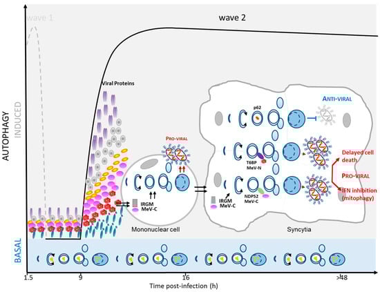 The second (late) wave of autophagy is maintained at a high level in MeV-infected cells for a long period of time (>48 h post-infection). This sustained autophagy involves, on one hand, the maintained expression of MeV-C in infected cells and, on the other hand, the fusion events between infected cells and uninfected cells [13,38] (Figure 2). Indeed, the mechanical fusion of cells using PEG (polyéthylène glycol) or fusogenic viral proteins is correlated with an increase of autophagy in such induced multinucleated cells, suggesting that syncytia formation by itself enhances autophagy [13]. Numerous enveloped viruses, including MeV, can lead to the formation of syncytia. This could reflect the constant requirement of autophagy in this type of cells to efficiently recycle their own components in order to maintain-homeostasis, but the precise role of intense autophagy in multinucleated cell biology remains unknown.