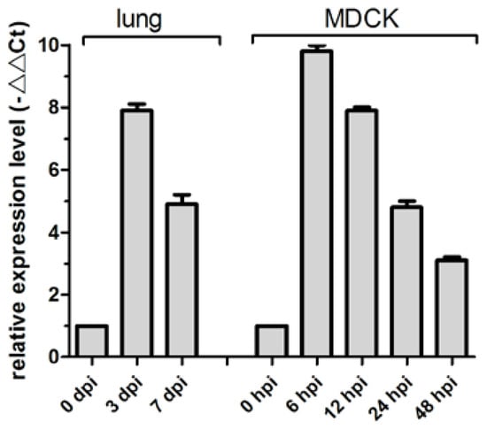 cfa-miR-143 expression was measured in canine influenza virus (CIV)-infected lungs and Madin-Darby Canine Kidney (MDCK) cells by real-time qPCR. The relative expression is depicted relative to the negative control at each time point. hpi: hour post-inoculation.