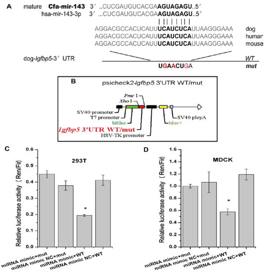 The Igfbp5 gene (NCBI Reference Sequence: XM_847792.4) was predicted as the target gene of cfa-miR-143 based on biological information from the online software platforms miRDB and TargetScan-Vet. The genomic DNA of MDCK cells was extracted using a Genomic DNA Extraction Kit (Tiangen, Beijing, China), and the 3′-untranslated region (UTR) of the target gene was amplified using specific primers (Table 1). The PCR products were gel-purified, digested, and inserted into the digested psicheck-2 vector (Promega, Madison, WI, USA) between the XhoI and PmeI sites. Igfbp5-3′UTR target site mutations were introduced using specific primers (Table 1). cfa-miR-143 mimic and inhibitor were artificially synthesized (RiboBio, Guangzhou, China). Subsequently, psicheck2-Igfbp5 3′-UTR wild type (WT) or mutant (mut) was individually co-transfected into 293T and MDCK cells using Lipofectamine® 2000 reagent (Invitrogen) with cfa-miR-143 mimic (50 nM) in 6-well plates. At 36 h post-transfection, luciferase activity was detected using a Dual-Glo Luciferase Assay Kit (Promega, Madison, WI, USA) according to the manufacturer’s protocol. Luminescence intensity was read using a  GloMax® Discover System (GM3000, Promega, Madison, WI, USA). The relative fluorescence value was calculated from the ratio of renal luciferase to firefly luciferase activity. Transfections were performed in duplicate and repeated thrice [].