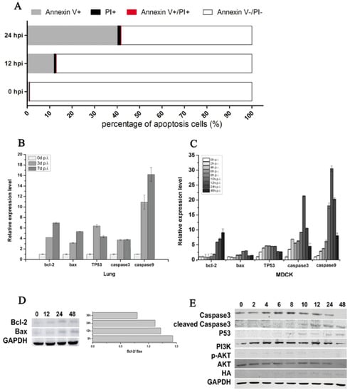 Flow cytometric analysis showed that CIV-induced MDCK cell apoptosis increased from 12.88% at 12 hpi to 41.74% at 24 hpi (Figure 3A). The percent of Annexin V+ shed was 12.10% at 12 hpi and 41.00% at 24 hpi, which indicated that CIV H3N2 induced the early apoptosis of MDCK cells. To further explore the mechanism of early cell apoptosis, apoptosis signaling gene expression was detected by qPCR and WB. The mRNA relative expression of bcl-2, bax, TP53, caspase3 and caspase9 increased in virus-infected lungs (Figure 3B) and in virus-infected MDCK cells (Figure 3C). The protein expression of HA appeared at 8 hpi and then maintained a stable expression level (Figure 3E), which consistent with the virus titers (Figure 4E) indicated that CIV H3N2 replicated in the cells and maintained stable virus titers. The protein expression of bcl-2 and bax increased in infected MDCK cells (Figure 3D), and the expression rate of bcl-2 and bax (bcl-2/bax) gradually increased from 0.8 at 12 hpi to 1.4 at 48 hpi (Figure 3D). The protein expression of caspase3 increased from 0 hpi to 8 hpi, and cleaved caspase3 significantly increased from 8 hpi to 48 hpi, which indicated cell apoptosis was occurring. The PI3K/AKT pathway has been shown to be activated in influenza virus-infected MDCK cells through the NS1 protein []. In this study, Akt phosphorylation (p-Akt) occurred during early infection (before 10 hpi) (Figure 3E), which is the viral replication stage [,], indicating that cell apoptosis was inhibited during the viral replication stage. The protein expression of p53 gradually increased from 6 hpi to 48 hpi (Figure 3E), suggesting that cell apoptosis was induced by the p53 pathway.