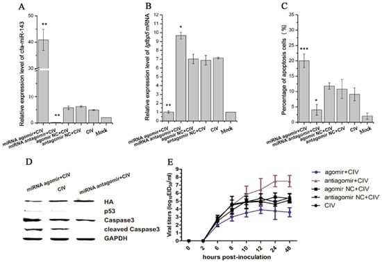 cfa-miR-143 expression significantly increased with cfa-miR-143 agomir transfection and significantly decreased with cfa-miR-143 antagomir transfection (Figure 4A). The expression of the target gene Igfbp5 significantly increased with cfa-miR-143 antagomir transfection in CIV-infected cells (Figure 4B). However, Igfbp5 expression significantly decreased with cfa-miR-143 agomir transfection in CIV H3N2-infected cells (Figure 4B). Meanwhile, the miRNA agomir significantly increased the percentage of apoptotic cells (Figure 4C) by activating p53 and caspase3 in CIV-infected cells (Figure 4D). Interesting, virus production decreased with miRNA agomir transfection and increased with miRNA antagomir transfection (Figure 4E).
