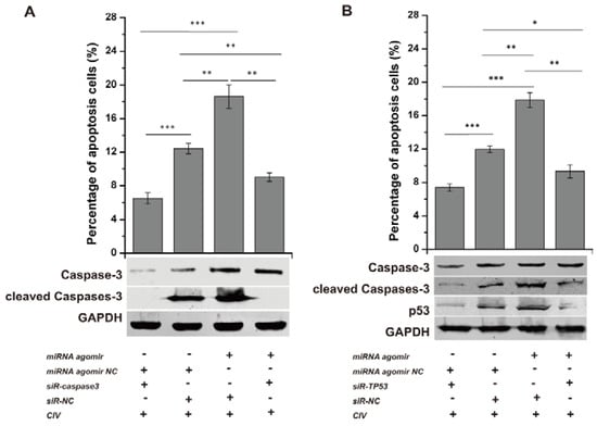 Interference assay. siRNAs were transfected into Madin-Darby Canine Kidney (MDCK) cells for 36 h and subsequently infected by CIV H3N2 (Multiplicity Of Infection, MOI = 1.0) at 12 h. The cells were collected to detect apoptosis. To explore the function of the p53 pathway in CIV-infected MDCK cells, siRNAs targeting TP53 (siR-TP53) and caspase3 (siR-caspase3) were applied individually or jointly with agomir and antagomir. siR-caspase3 restricted the expression and activation of caspase3 as shown by Western blotting and decreased the apoptosis induced by the cfa-miR-143 agomir as shown by flow cytometry (A); siR-TP53 restricted the expression and activation of p53 and the activation of caspase3 as shown by Western blotting and decreased apoptosis induced by cfa-miR-143 agomir as shown by flow cytometry (B). Differences in expression levels were considered significant if p < 0.05 (* p < 0.05; ** p < 0.01; *** p < 0.001).