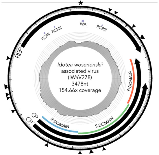 IWaV278 was characterized via computational assembly (de Bruijn) and Sanger sequencing (inverse PCR, accession number: MG023125). The IWaV278 genome is larger than most CRESS-DNA viruses (3478 nt), but comparable in size to members of the Cruciviridae/Tombusviridae clades [16,21,22]. The genome had approximately 154.7× coverage (2450 total reads) in I. wosnesenskii viromes enriched for circular, ssDNA templates. This genotype is complete (circularized), and displays the general genome architecture of type III CRESS-DNA viruses (Figure 1; [12]). IWaV278 contains a 728 nt intergenic region with two flanking ambisense ORFs: (1) a 385AA (1245 nt) sense-oriented rolling circle replication (Rep) ORF homologous to the replicase gene of Tadarida brasiliensis circovirus genotype 1 (YP_009170674.1, e-value < 2 × 10−28), and (2) a 418AA (1503 nt) antisense-oriented putative structural ORF (Cp) homologous to the predicted capsid protein of Cruciviridae genotype CRUV-15-B (AQU11701.1, e-value < 9 × 10−29) with an alternate stop codon that truncates 83AA (243 nt) from the C-terminal domain of Cp (Cp’).