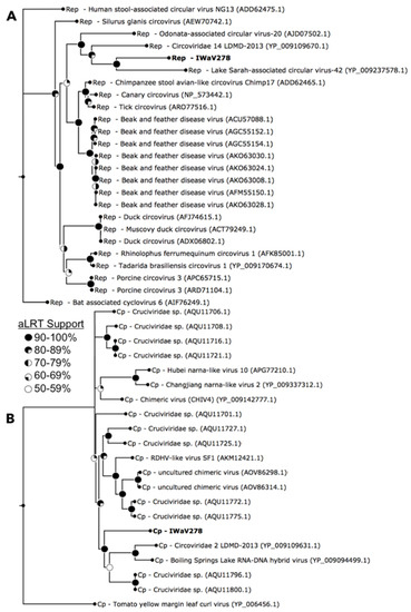 Maximum likelihood phylogeny of Rep (A) and Cp (B) open reading frames. Phylogenies were constructed via smart model selection (Rep: LG+G+I, Cp: RtREV+G+F) implemented in PhyML and visualized via FigTree v.1.4.2. Terminal nodes indicate IWaV278-ORFs and associated best BLASTx hits (e-value <1 × 10−5). Sequences and outgroups (Rep: bat associated cyclovirus 6; Cp: tomato yellow margin leaf curl virus) were aligned in MUSCLE v.3.8 and manually masked (Rep: 306AA, Cp: 523AA). Internal nodes represent SH-like aLRT branch support (nodes exhibiting <50% aLRT support collapsed; [37]).