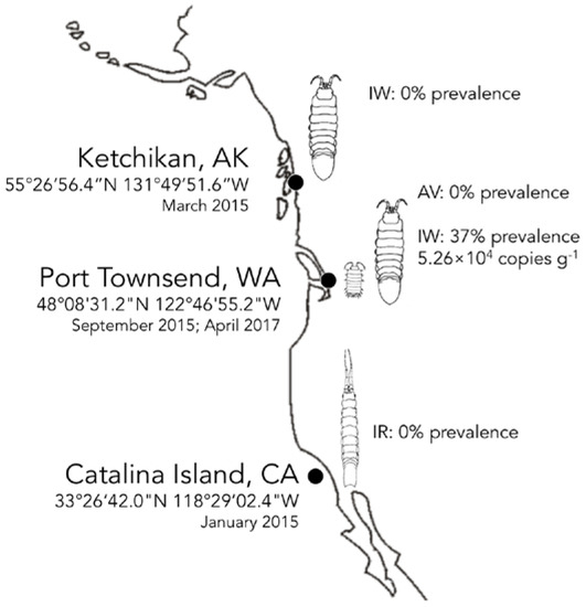 Biogeography of IWaV278 among intertidal isopods on the Pacific Coast of North America. Distribution (prevalence and average load g−1) of genotype IWaV278 was quantified in Idotea wosnesenskii from Washington and Alaska, USA, via qPCR targeting IWaV278-rep. IWaV278 was not detected in taxonomically-related isopods (IR—Idotea resecata) from the Channel Islands (USC Wrigley Institute, CA, USA), sympatric isopods (GO—Gnorimosphaeroma oregonensis) or primary dietary substrate (Nereocystis sp.).