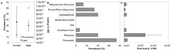 Distribution and tissue specificity of IWaV278. (A) Prevalence and average load g−1 (±1 SE) of IWaV278 in male and female I. wosnesenskii from the Port Townsend (WA, USA); (B) prevalence of IWaV278 in major I. wosnesenskii organ systems; and (C) average load g−1 (±1 SE) of IWaV278 in major I. wosnesenskii organ systems detected via qPCR targeting IWaV278-rep.