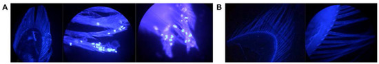 Tissue types with the greatest viral prevalence and load were frequently highly ciliated (high density of bristle-like setae), particularly in male I. wosnesenskii. Multiple isopod genera are known to harbor a variety of photosynthetic and non-photosynthetic eukaryotic epibionts, often on analogous ciliated structures [52,53,54]. Fluorescent microscopy of I. wosnesenskii revealed possible unicellular organisms accumulated on pleopod cilia/setae, which could conceivably serve as cellular hosts for IWaV278 (Figure 5). IWaV278 was absent from pleopods washed with sterile, virus-free water, but detectable in the resulting wash supernatant (40% prevalence, 3.2 × 104 ± 5.0 × 103 copies μL−1 of supernatant), signifying a tenuous correlation between IWaV278 and the presence of unicellular epibionts. This observation aligns with hypotheses from previous investigations, which speculate that chimeric viruses may be associated with unicellular eukaryotic hosts [22].