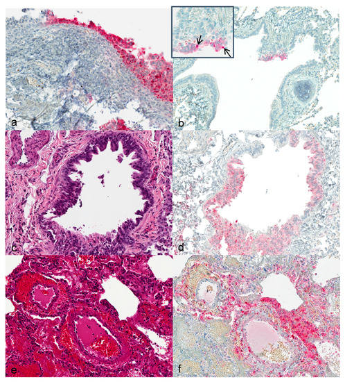 Lung: Hyperplastic bronchiolar epithelial cells were observed at 3 dpi with detection of viral antigen (Figure 1b). By day 7, epithelium presented with acantholysis and showed signs of acute necrosis (Figure 1c). At 12 and 14 dpi multifocal bronchopneumonia with degeneration and acute necrosis of bronchiolar epithelium (Figure 1e) was observed. Viral antigen was detected in bronchiolar epithelial cells at 3 dpi in the lung of animals that were infected with the higher dose. From day 7 to 12 onwards, viral antigen was seen in the lungs of all animals (Figure 1d,f).