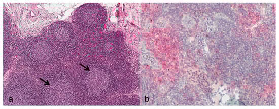Histological and immunohistological findings in the lymphatic system. (a) Animal no. 4. Submandibular lymph node, common marmoset, 5 dpi. reactive lymphoid hyperplasia, follicular pattern, with enlarged follicles and reactive germinal centers (arrows). Magnification: 20×. HE; (b) animal no. 12. Submandibular lymph node, common marmoset, 10 dpi. Multifocally distributed immunopositive cells. IHC. Magnification: 40×.