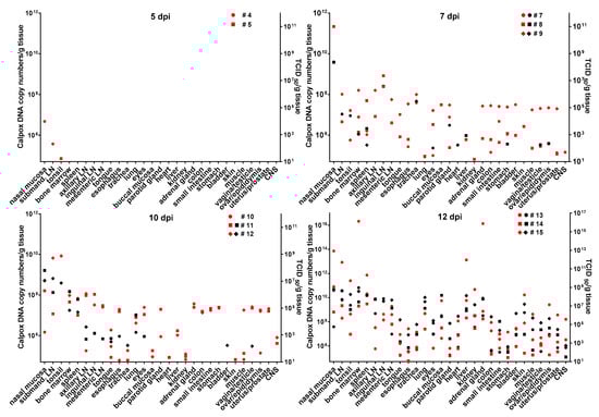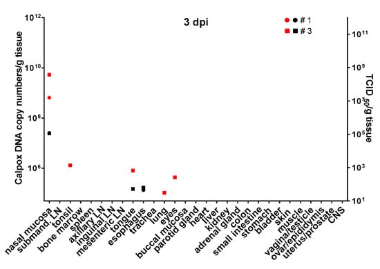 Infectious calpox virus in tissues was quantified by endpoint dilution assay and compared to real-time PCR results using the same tissue preparation. Data obtained by the two different techniques were normalized to one gram of tissue. It was difficult to predict at which time point after inoculation we would be able to find first traces of virus with our assays. Thus, we started sacrificing animals five days after inoculation with 8.3 × 103 PFU of calpox virus. Indeed, low levels of viral DNA (7 × 104–4.7 × 106 copy numbers/gram tissue) were detectable in two out of three animals, i.e., in one in the tonsil, and in the other in nasal mucosa and submandibular lymph node (Figure 3, upper left panel), but no virus was isolated from any organ. Next, we euthanized animals inoculated with the same dose at days, 7, 10 and 12. In animals sacrificed one week after inoculation, our findings indicated a systemic spread of the virus. At this time, when considering the findings from the three animals collectively, all organs tested were found to be positive for viral DNA, from half of them infectious virus was isolated. Highest viral loads were observed in the nasal mucosa of one animal (animal no. 8: 2.2 × 1011 DNA copies and 2.3 × 108 TCID50). In the other organs, viral loads were lower ranging from around 105–109 DNA copy numbers and 102–4 × 107 TCID50 (Figure 3, upper right panel). By day 10, viral loads did not seem to have increased compared to those observed in the day-7 animals (Figure 3, lower left panel). On this day of necropsy, infectious virus was detectable in only around 50% of the tissues, and levels of infectivity were the same (animal 11, nasal mucosa), or between one and five orders of magnitude lower compared to DNA copy numbers. Overall, highest viral loads were detected in the day-12 animals, reaching up to 1016 copy numbers (animal 13, nasal mucosa, bone marrow and adrenal gland) and up to 109 infectious units (animal 13, bone marrow). It is of note that from each organ and mostly from all three animals, infectious virus was recovered at this time point (Figure 3, lower right panel). To investigate the events that took place even earlier following viral inoculation, i.e., 3 dpi, and as hardly any virus was detectable in the day-5 animals, we increased the viral dose 40-fold for the animals to be sacrificed three days after virus application. In two of the three animals, viral DNA and infectious virus was found, one further animal remained negative for the two parameters in any organ. In the two animals being positive for virus, 6 × 108–5 × 109 viral DNA copy numbers, as well as considerable levels of infectious virus (105 TCID50) were found in the nasal mucosa. In addition, one animal was positive for viral DNA in tonsil, tongue, lung and eyes, but loads were three or more orders of magnitude lower compared to the nasal mucosa (≤106 copy numbers). Low numbers of infectious virus (~50 TCID50) were also found in tongue and esophagus (Figure 4).