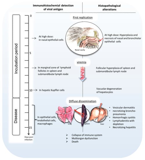 To sum up, only discrete virus-associated lesions were observed within the first 10 days after infection. The primary target organ with proof of intralesional viral antigen was the nasal epithelium (3 dpi). Submandibular lymph nodes showed follicular hyperplasia along with the presence of viral antigen at day 7. At 10 dpi, viral antigen was detectable within the liver, i.e., Kupffer cells. From day 12 onwards, virus-associated pneumonia, hepatitis, dermatitis, splenitis, and lymphadenitis with lymphocytic depletion were seen (see Table 2).