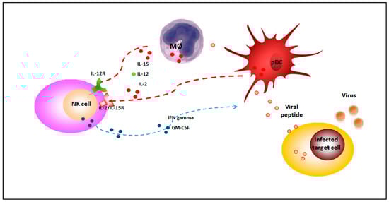 NK cells during viral infections. During viral infections, NK cells are activated by IL-2, IL-12 and IL-15, released by plasmacytoid dendritic cells (pDC) and monocytes/macrophages (MØ) (red dotted lines) and secrete potent cytokines, such as interferon gamma (IFN-gamma), that lyse susceptible targets and enhance innate and adaptative immune responses (blue dotted line). NK: natural killer; IL-2/IL-15R: IL-2/IL-15 receptor; IL-12R: IL-12 receptor; IFN-gamma: Interferon gamma; GM-CSF: Granulocyte-macrophage colony-stimulating factor.