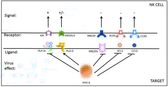 HHV-6 effect on NK cell receptor–ligand interaction. During HHV-6 infection, both NK cells and infected target cells present a modified pattern of receptor–ligand expression, that affect NK cell status. KIR: killer immunoglobulin-like receptors with inhibitory functions; KIR2DL4 with both inhibitory and activating functions; NKG2D activating receptor; XCR1 and CCR5 (C-C chemokine receptor) chemokine receptors. Virus effect: arrow means activated, T bar means inhibited; signal: + means activating signal, +/− means both activating and inhibitory signal, − means inhibitory signal.