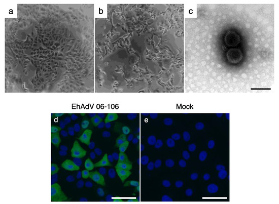 Figure 1. Isolation of E. helvum adenovirus (EhAdV) 06-106 with Vero E6 cells (upper panels). Control cells (a) and infected cells showing cytopathic effects (b); Transmission electron microgram of EhAdV 06-106 virions (c); Bar represents 100 nm. Detection of viral antigens in EhAdV 06-106-infected Vero E6 cells using anti-human adenovirus type 5 polyclonal antibody (lower panels). EhAdV 06-106-infected cells (d) and mock-infected cells (e); Nuclei of cells were stained with DAPI (4′,6-diamidino-2-phenylindole) (blue). Scale bars represent 50 μm.
