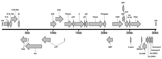 27. Chroboczek, J.; Bieber, F.; Jacrot, B. The sequence of the genome of adenovirus type 5 and its comparison with the genome of adenovirus type 2. Virology 1992, 186, 280–285. [Google Scholar] [CrossRef]