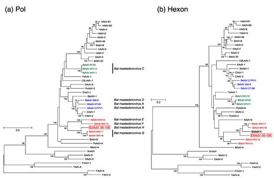 Figure 4. Maximum-likelihood phylogenetic trees based on the predicted amino acid sequences for DNA polymerase (pol) (a) and hexon (b). The dendrograms of pol and hexon were constructed using an LG (Le and Gascuel, 2008) model with gamma distribution and invariable sites with the highest log likelihood (−27,885.86709), and an LG model with gamma distribution with the highest log likelihood (−20,968.7769), respectively. The percentages at nodes are bootstrap probabilities calculated using 1000 replicates and indicate bootstrap supports >70%. Bat adenoviruses in groups 1 to 3 in Figure 3 are shown in colors. Open rectangles and gray-shaded rectangle indicate EhAdV 06-106 and EhAdV 1 isolated in Ghana, respectively. Bars indicate the number of substitutions per site. The sequences listed in Table S1 and EhAdV 1 (GenBank accession number: JX885602) were used.