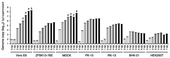 Figure 5. Quantitation of viral DNA in the supernatants of various mammalian cells infected with EhAdV 06-106 using real-time PCR. Data are shown as the means and standard deviations from triplicate reactions. Daggers indicate the points when cytopathic effect was remarkable. Dpi indicates day(s) post infection. ZFBK: Fruit bat kidney; MDCK: Madin-Darby canine kidney; PK: Porcine kidney; RK: Rabbit kidney; BHK; Baby hamster kidney; HEK: Human embryonic kidney.