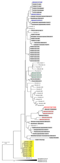 Figure 6. Maximum-likelihood phylogenetic trees based on the partial amino acid sequences of DNA polymerase (pol). The dendrogram was constructed with an LG model with gamma distribution with the highest log likelihood (−3122.742588). The percentages at nodes are bootstrap probabilities calculated using 1000 replicates and indicate bootstrap supports >70%. Open rectangles and gray-shaded rectangles indicate bat-derived adenoviruses detected in E. helvum in this study and bat-derived adenoviruses, respectively. Bat adenoviruses in groups 1 to 3 in Figure 3 are shown in colors. Eight newly detected E. helvum-derived adenoviruses are highlighted in yellow. Bar indicates the number of substitutions per site. The sequences listed in Table S1 and previously reported in bat adenoviruses [12,13].