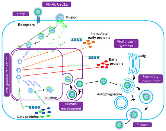 Summary of the Herpesvirus replication cycle. Initiation of infection begins with the adsorption of the viral particle to cell surface receptors and the virus enters the cell either by fusion of its envelope with the plasma membrane or by endocytosis, releasing the capsid and the tegument into the cytoplasm. Using the microtubule network, the nucleocapsid is transported to the nuclear pore, where the viral genome is released into the nucleus and circularizes. The viral DNA serves as a template for Pol II and leads to the production of mRNAs, expressed in three successive and coordinated phases. mRNAs are translated in the cytoplasm into viral proteins (α, or immediate-early; β, or early; and γ, or late proteins). Most of the late gene products contribute to the formation of the viral particle. DNA packaging into pre-assembled capsids takes place in the nucleus. This is followed by a primary envelopment of the nucleocapsids by budding through the inner nuclear membrane. The envelope of perinuclear virions then fuses with the outer nuclear membrane to release naked nucleocapsids into the cytoplasm (de-envelopment). Tegumented capsids acquire a “second” final envelope to become virions from post-Golgi membrane compartments. A role for autophagic membranes in envelopment and release of virions has been proposed for some herpesviruses. Once formed, virions are translocated to the cell surface within small vesicles using exocytosis machinery and released from the cells.