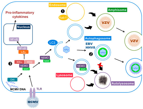 Subversion of autophagy during the lytic cycle. ➊,➋ Herpesviruses can use autophagy-derived vesicles for their transport within the cytoplasm and their release. ➊ VZV particles are incorporated in amphisome, a vacuole resulting from the fusion of autophagosome and endosome. ➋ Autophagosomes transport HHV8 and EBV particles to the cell surface. The viruses block autophagosome fusion with the lysosome to avoid degradation (red×). Moreover, EBV uses autophagosomal membrane for secondary envelopment and LC3 can be found in the virion. ➌ MCMV infection triggers the inflammatory cascade, via activation of TLRs and DAI (DNA-dependent activator of interferon regulatory factors), leading to nuclear translocation of NF-κB and transcription of pro-inflammatory cytokines. The viral protein M45 targets NEMO (NF-κB Essential Modulator), a protein involved in the activation of NF-κB, and redirects it to autophagosomes, where it will be degraded after fusion with the lysosome.