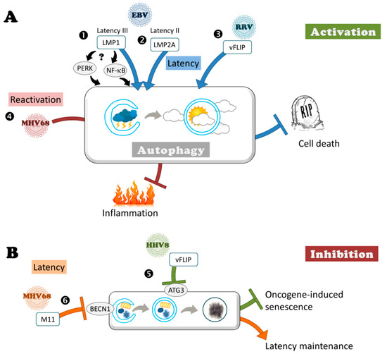 Autophagy can nip inflammation in the bud to allow MHV68 reactivation. A recent study demonstrated for the first time the beneficial role of autophagy for Herpesvirus in vivo during latency [100]. This was observed in the context of infection of mice with the murine gammaherpesvirus MHV68, which results in lymphoproliferative diseases, similarly to human gammaherpesvirus EBV and HHV8. MHV68 latency occurs in peritoneal macrophages and splenic B cells. Systemic inflammation, and in particular interferon-γ (IFN-γ), impedes reactivation of MHV68 from latently-infected macrophages [101]. Maintaining a low level of inflammation is therefore necessary to allow the reactivation of the virus. Autophagy, by limiting virus-induced inflammation, enhances reactivation from latency. Park and collaborators observed that deficiency in multiple autophagy genes, such as ATG3, ATG5, ATG7, BECN1, or ATG16 in the myeloid compartment decrease the reactivation rate. However, lack of ATG4b gene does not hamper MHV68 reactivation, but this discrepancy may be related to the presence of different isoforms of ATG4 acting on LC3 conjugation. Although MHV68 also establishes latency in splenic B cells, ATG5 deficiency in B cells had no effect on reactivation. Promotion of reactivation by autophagy is due to a decreased production of IFN-γ by T cells (even if this cytokine is not the sole contributor) rather than a direct action on viral replication or on the establishment of latency. Indeed, no evidence for a cell-intrinsic role for ATG genes in MHV68 infection was observed and viral multiplication during early lytic cycle was identical during the first week of infection in peritoneal cells and in macrophages. It would be simplistic to think that by decreasing the autophagy level, the host could boost the inflammation level and, therefore, potentially block any reactivation of these latent viruses. However, this would be at the expense of the organism, with serious complications following a chronic inflammation. It would be simplistic to think that by decreasing autophagy levels, the host could boost inflammation levels and, therefore, potentially block any reactivation of latent viruses. However, this would be at the expense of the organism, with serious complications following chronic inflammation.
