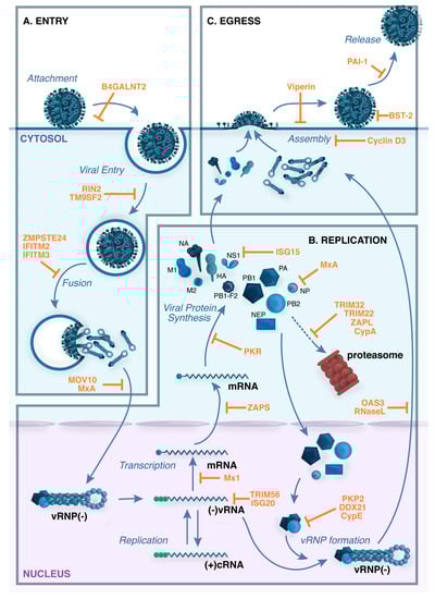 Most of the antiviral factors against influenza virus that have been identified to date target genomic replication and/or translation during the influenza virus life cycle. Certain restriction factors target particular viral proteins (e.g., NP, M1, polymerase basic (PB)1 and PB2), to promote their degradation and/or alter cellular localization, whilst other restriction factors target the viral genome itself. While virus attachment, entry and fusion are generally not altered by expression of these restriction factors, impaired viral replication will also ultimately inhibit virus release.