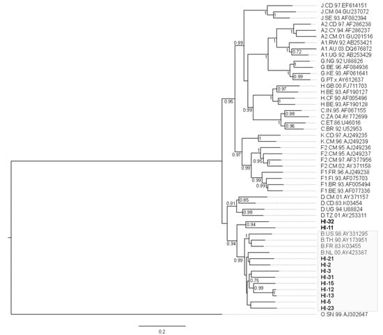 Phylogenetic maximum likehood analysis of HIV near full-length genomes obtained in this study. The analysis was conducted with 1000 bootstrap iterations and included eleven HIV-1 proviral sequences from Hospital Federal de Ipanema, Rio de Janeiro (represented in bold) and references of HIV-1 subtypes (represented by the subtype, country, year and GenBank accession number). Only bootstrap values greater than 0.7 are shown. The gray box highlights the sequences classified as subtype B, among which nine of the eleven sequences were placed. The two remaining sequences represented unique recombinant forms comprising subtype B and other subtypes.