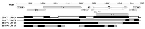 - Passaes, C.P.; Guimaraes, M.L.; Bello, G.; Morgado, M.G. Near full-length genome characterization of HIV type 1 unique BC recombinant forms from Southern Brazil. AIDS Res. Hum. Retrovir. 2009, 25, 1339–1344. [Google Scholar] [CrossRef] [PubMed]