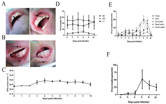 Clinical observation of herpes simplex virus type 1 (HSV1)-infected rhesus macaques. (A) vesicle in oral mucosa of macaques, indicated by black arrows; (B) multi-vesicles in oral mucosa of macaques, indicated by black arrows; (C) body temperatures of infected monkeys were measured by the anal route twice each day post-infection; (D) hematological analyses of lymphocytes (LY), monocytes (MO), and neutrophils (NE) from infected macaques; (E) feces, urine, oral swabs, nasal swabs and ocular swabs were collected continuously for 10 days after infection and detection of virus shedding. Oral swabs, nasal swabs, ocular swabs and feces indicated the total volume of the eluate; and (F) blood samples were collected and assessed for viral load.