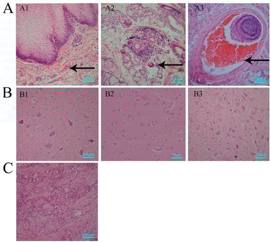 Pathological features of macaques in acute HSV1 infection. (A) vesicular lesions in oral skin of the epidermis (A1) (#14065), sebaceous glands (A2) (#14065) and hair follicle (A3) (#14137), structural damage and obvious inflammatory cell infiltration underneath in A1 and A2, and hyperemia in A3; (B) nervous tissues, including spinal cord (B1) (#14065), thalamus (B2) (#14065) and mesencephalon (B3) (#14137); no obvious structural damage was observed; (C) pathological analysis of TG (#14065); no pathological changes. Positive pathological changes are indicated by black arrows. Scale bars = 50 µm in B2, and B3, scale bars = 100 µm in A, B1, and C.
