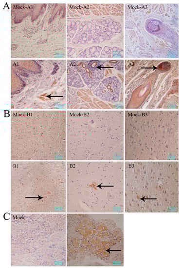 In our study, histopathological lesions were detected in major tissues, especially in the central nervous system of the infected macaques sacrificed via anesthesia after clinically recording symptoms for ten days post-infection. First, observations of oral tissue sections with vesicular lesions indicated that the vesicles were due to structural damage in the epithelium (Figure 2A1) and sebaceous glands (Figure 2A2), with obvious inflammatory cell infiltration underneath, and were associated with hyperemia in the hair follicles (Figure 2A3). IHC detection using specific antibodies against HSV1 for the same tissue sections showed expression of viral antigens in cells (Figure 3A1–A3). Similar results were observed for the nervous tissues, including the spinal cord (Figure 2B1), thalamus (Figure 2B2) and mesencephalon (Figure 2B3). Pathological analysis of these tissues suggests no obvious structural damage except a focal point of inflammatory cell infiltration, while IHC detected viral antigens (Figure 3B1–B3). Interestingly, similar negative pathological changes (Figure 2C) and positive viral antigen (Figure 3C) detection were identified in the TG, and the viral antigen expression detected in neurons also suggested viral preference to the TG. In contrast, both methods of virus detection in other major organs, including heart, kidney, liver and gallbladder, indicated negative results (Table S2). These data suggested that HSV1 infection in rhesus macaques was capable of inducing vesicular lesions in the oral skin or mucosa and of mediating viral replication at least in nervous tissues through an unknown mechanism without pathological damage.
