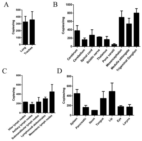 Previous etiological analysis of the HSV1 genome in tissues from infected humans suggested that the virus existed in nervous or non-nervous tissues in a latent state during the infection [36,37]. An identical study in mice also suggested the presence of viral genomes in various tissues post-infection [29]. In our study, we verified viral loads in various tissues from macaques sacrificed via anesthesia on day 10 after infection via q-PCR and virus titration and found high viral loads in the respiratory organs (Figure 4A). However, the high viral distribution in the nervous tissue also included peripheral nerves and the CNS, especially the TG (Figure 4B). While some lymph nodes showed similar viral loads (Figure 4C), various organs presented different viral loads (Figure 4D). These results confirmed previous observations and suggested that HSV1 is capable of replicating in various tissues, especially nervous tissues, in rhesus macaques, similar to that in humans.