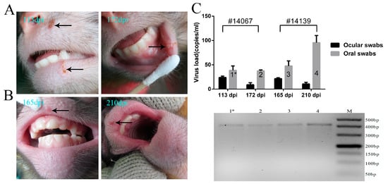 Recurrence of blebs in the oral skin and mucosa within four to five months post-infection. (A) spontaneously recurring vesicular lesions on macaque No. 14067 on days 113 and 172; (B) spontaneously recurring vesicular lesion on macaque No. 14139 on days 165 and 210; (C) oral swabs and ocular swabs were collected from No. 14067 and No. 14139 on recurring vesicular lesion day, and viral shedding was detected; the 1* bar indicates a positive result for viral genomic DNA by PCR in lane 1* (panel below) with primers against UL48 (405 bp); lanes 2, 3 and 4 of PCR electropherograms correspond to 2, 3 and 4 of the graph above, respectively (panel above).