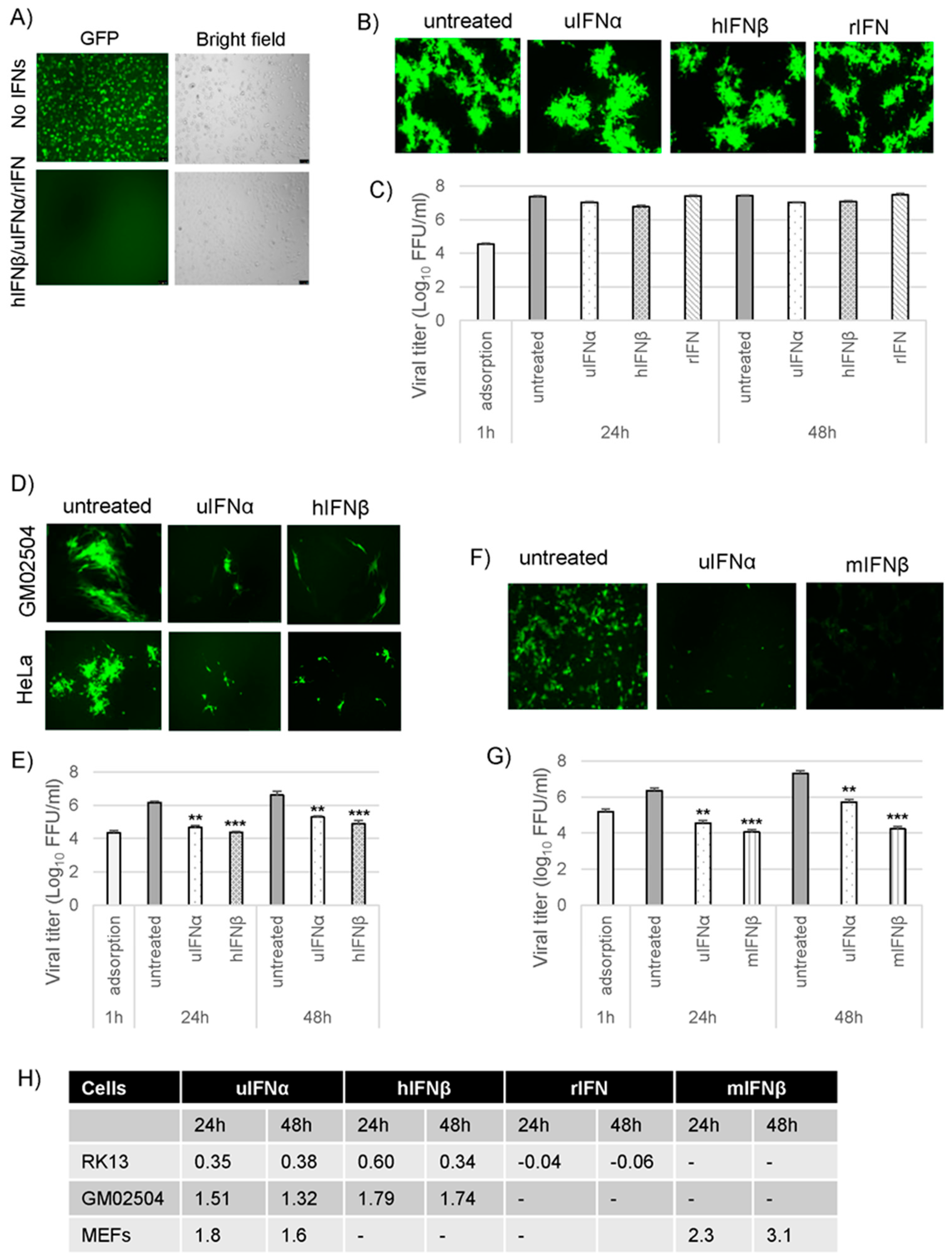 Myxoma virus (MYXV) is able to inhibit the type I interferon (IFN)-induced antiviral state completely in rabbit cells, partially in human cells and poorly in mouse cells. RK13 cells were individually treated with uIFNα, hIFNβ or rIFN containing media for 18 h and (A) infected with vesicular stomatitis virus (VSV)-GFP at a multiplicity of infection (MOI) of 1.0, fluorescence images were taken 48 h post-infection (hpi) and a representative image is shown; scale bars (100 µm); (B) infected with the wild-type (WT)-MYXV at an MOI of 0.01 and fluorescence images were taken 48 hpi; (C) infected with the wild-type (WT)-MYXV at an MOI of 5.0 and then cells were collected at 1 h (adsorption), 24 h and 48 hpi for virus titration; (D) Human GM02504 primary fibroblasts or HeLa cells were treated with uIFNα or hIFNβ containing media for 18 h and infected with the WT-MYXV at an MOI of 0.01 and fluorescence images were taken 48 h after infection; (E) GM02504 cells were mock or treated with uIFNα or hIFNβ containing media for 18 h and infected with the WT-MYXV at an MOI of 5.0 and then cells were collected at 1 h (adsorption), 24 h and 48 h after infection for virus titration; (F) Mouse embryo fibroblast (MEF) cells were treated with uIFNα or mIFNβ containing media for 18 h and infected with the WT-MYXV at an MOI of 1.0 and fluorescence images were taken 48 h after infection; (G) MEF cells were mock or treated with uIFNα or mIFNβ containing media for 18 h and infected with the WT-MYXV at an MOI of 5.0 and then cells were collected at 1 h (adsorption), 24 h and 48 hpi for virus titration. The virus titers were determined in triplicate following serial dilution onto RK13 cells. Statistics are relative to untreated virus titer after 24 h or 48 h infection. ** p < 0.01 *** p < 0.001; (H) Table showing log10 changes in virus titer after different type I IFN treatment compare to the untreated samples at 24 h and 48 h in RK13, GM02504 and MEFs.