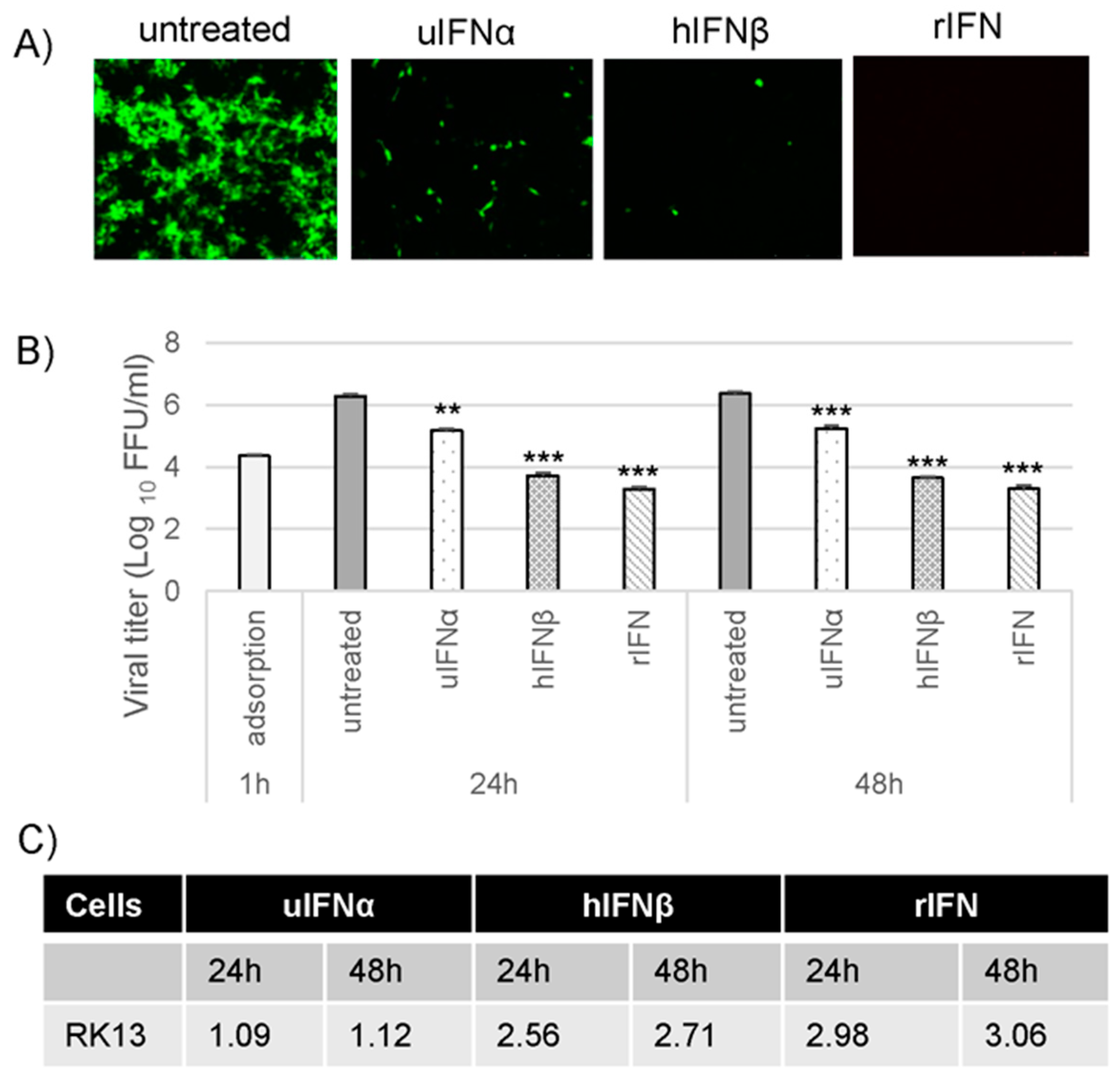 Cells were seeded in multiwell dishes the day before infection with 60%–70% confluency. The following day cells were treated individually with hIFNβ/mIFNβ/uIFNα (PBL Assay Science, Piscataway, NJ, USA; 500 U/mL) or rabbit IFN containing media [26] for 18 h and then infected with the viruses with different multiplicity of infection (MOI) depending on the experiments. One hour post-infection (hpi), the media were removed, washed and incubated with fresh medium containing no or same concentration of IFN that was added. For post-IFN treatment, the cells were first infected with the viruses for one or six hours (h), the media were removed, washed and incubated with the IFN containing media. For microscopy, at 24 or 48 hpi, the infected cells were visualized under an inverted fluorescence microscope and photographed with a digital camera. For viral replication assays, cells were harvested at various times post-infection and stored in −80 °C until processed. Before titration cells were freeze-thawed at −80 °C and 37 °C for three times and sonicated for one minute to release the viruses from infected cells. Depending on the viruses, they were tittered back either RK13 or RK13-E3 cells by serial dilution.