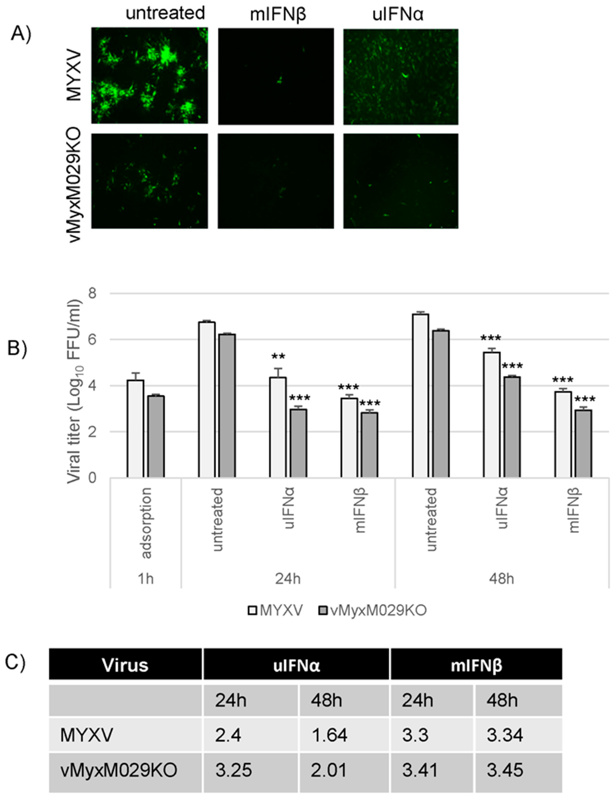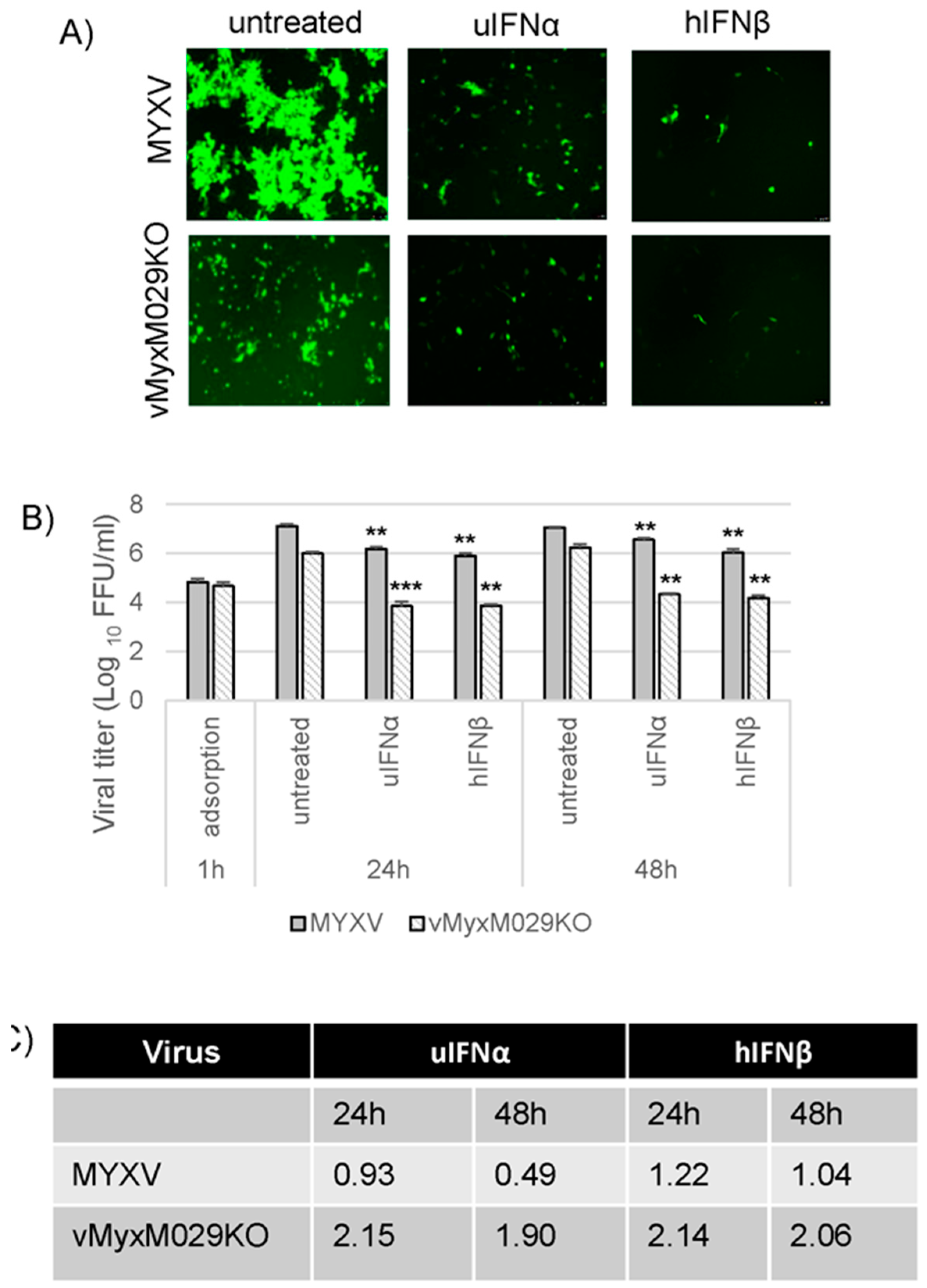 M029 is required for partial inhibition of the type I IFN-induced antiviral state in human cells; (A) HeLa PKR-/- cells were treated with uIFNα or hIFNβ containing media for 18 h and infected with the WT-MYXV or vMyxM029KO viruses at an MOI of 0.01 and fluorescence images were taken 48 hpi; (B) HeLa PKR-/- cells were mock or treated with uIFNα, hIFNβ containing media for 18 h and infected with the WT-MYXV or vMyxM029KO viruses at an MOI of 5.0 and then cells were collected at 1 h (adsorption), 24 h and 48 hpi for virus titration. The virus titers were determined in triplicate following serial dilution onto permissive RK13-E3 cells. Statistics are relative to untreated virus titer after 24 h or 48 h infection. ** p < 0.01 *** p < 0.001; (C) Table showing log10 changes in virus titer after different type I IFN treatment compare to the untreated samples at 24 h and 48 h in HeLa PKR-/- cells.