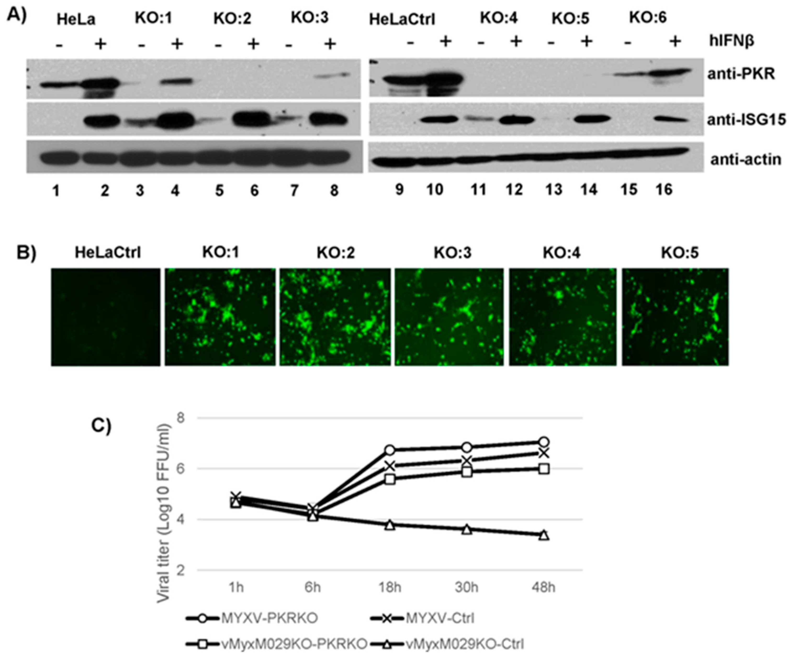 HeLa cells with an inactivated PKR gene were generated by using the CRISPR/Cas9 plasmid (Santa Cruz Biotechnology) according to the manufacturer’s instructions. After transfection, cells were treated with puromycin (2 μg/mL) for 48 h. The surviving cells were plated in 96-well plates with ~1–5 cells/well. Colonies were expanded and were selected according to their ability to support replication of vMyxM029KO virus.