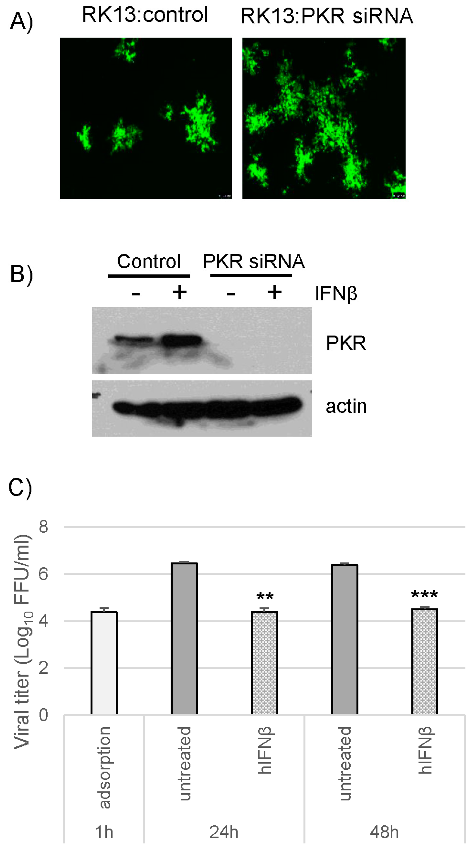 Knockdown of PKR cannot rescue M029-minus MYXV sensitivity to the type I IFN-induced antiviral state in rabbit RK13 cells. RK13 cells were transiently transfected with siRNAs targeting rabbit PKR for 48 h before infection with the viruses or treatment with hIFNβ; (A) Control or PKR knockdown RK13 cells were infected with vMyxM029KO virus at an MOI of 0.01 and fluorescence images were taken 48 hpi; (B) Western blot analysis of PKR knockdown RK13 cells to detect endogenous PKR and actin as loading control; (C) PKR knockdown RK13 cells were infected with vMyxM029KO viruses before or after treatment with hIFNβ at an MOI of 5 and then cells were collected 1 h, 24 h and 48 h for titration onto RK13-E3 cells. Statistics are relative to untreated virus titer after 24 h or 48 h infection. ** p < 0.01 *** p < 0.001.