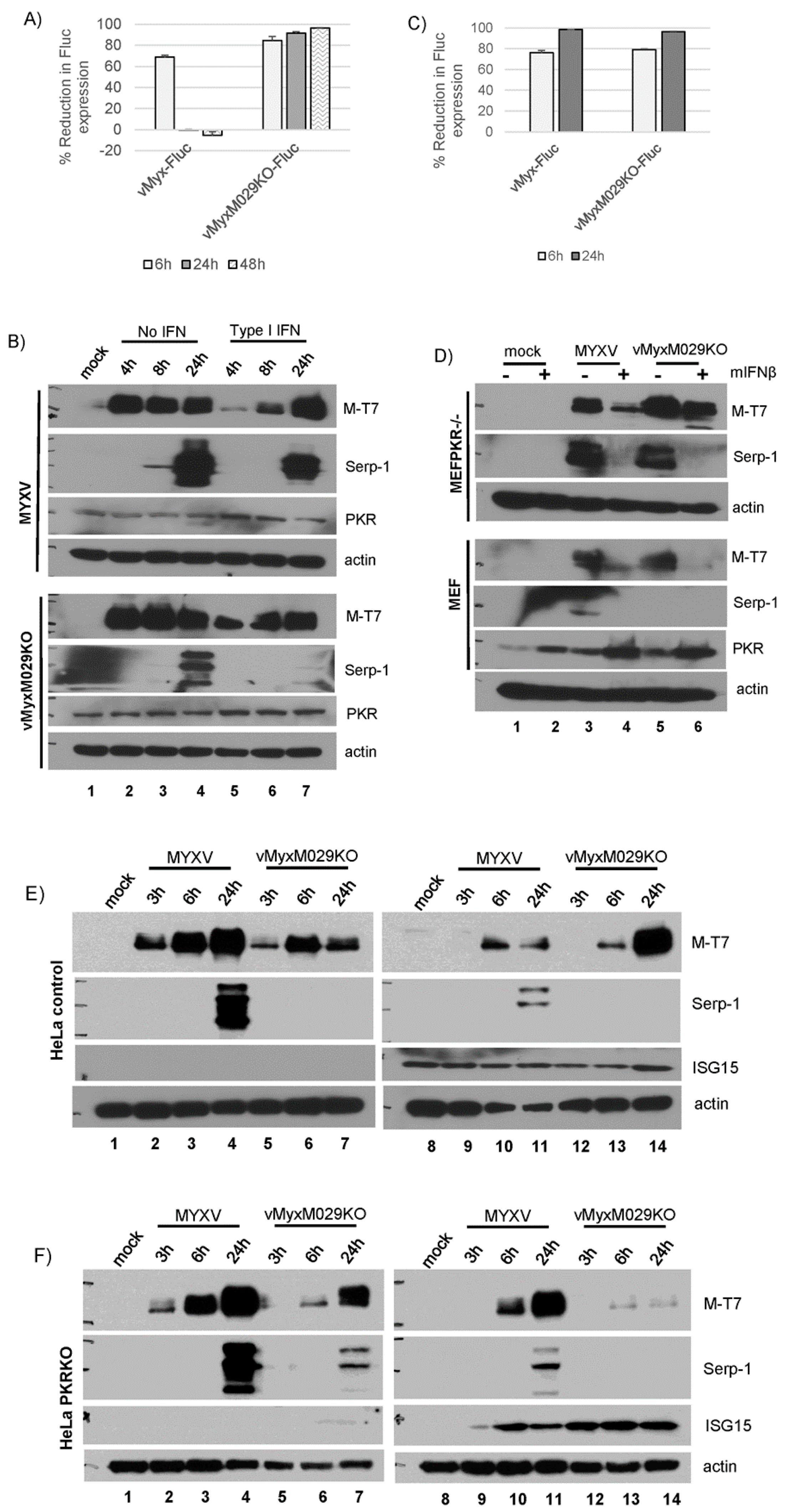 Type I IFN-induced antiviral state can inhibit the expression of MYXV early and late proteins in a species-specific manner; (A) Rabbit RK13 and (C) Mouse MEF PKR-/- cells were treated with hIFNβ and mIFNβ containing media for 18 h and infected with vMyx-FLuc (WT-MYXV) or vMyxM029KO-FLuc viruses for the indicated time points. Cells were then processed for luciferase assay. Percent reduction in FLuc expression was calculated from the samples not pretreated with IFNs. The assay was performed in triplicate; (B) Rabbit RK13 cells were treated with mock or hIFNβ containing media for 18 h and infected with WT-MYXV or vMyxM029KO viruses and cells were collected at the indicated time points for Western blot analysis; (D) Mouse MEFs and MEF PKR-/- cells were treated with mock or mIFNβ containing media for 18 h and infected with WT-MYXV or vMyxM029KO viruses and cells were collected at he indicated time points for Western blot analysis; (E) Human HeLa control and (F) HeLa PKR-/- cells were treated with mock (lanes 1-7) or hIFNβ (lanes 8-14) containing media for 18 h and infected with WT-MYXV or vMyxM029KO viruses and cells were collected at the indicated time points for Western blot analysis.