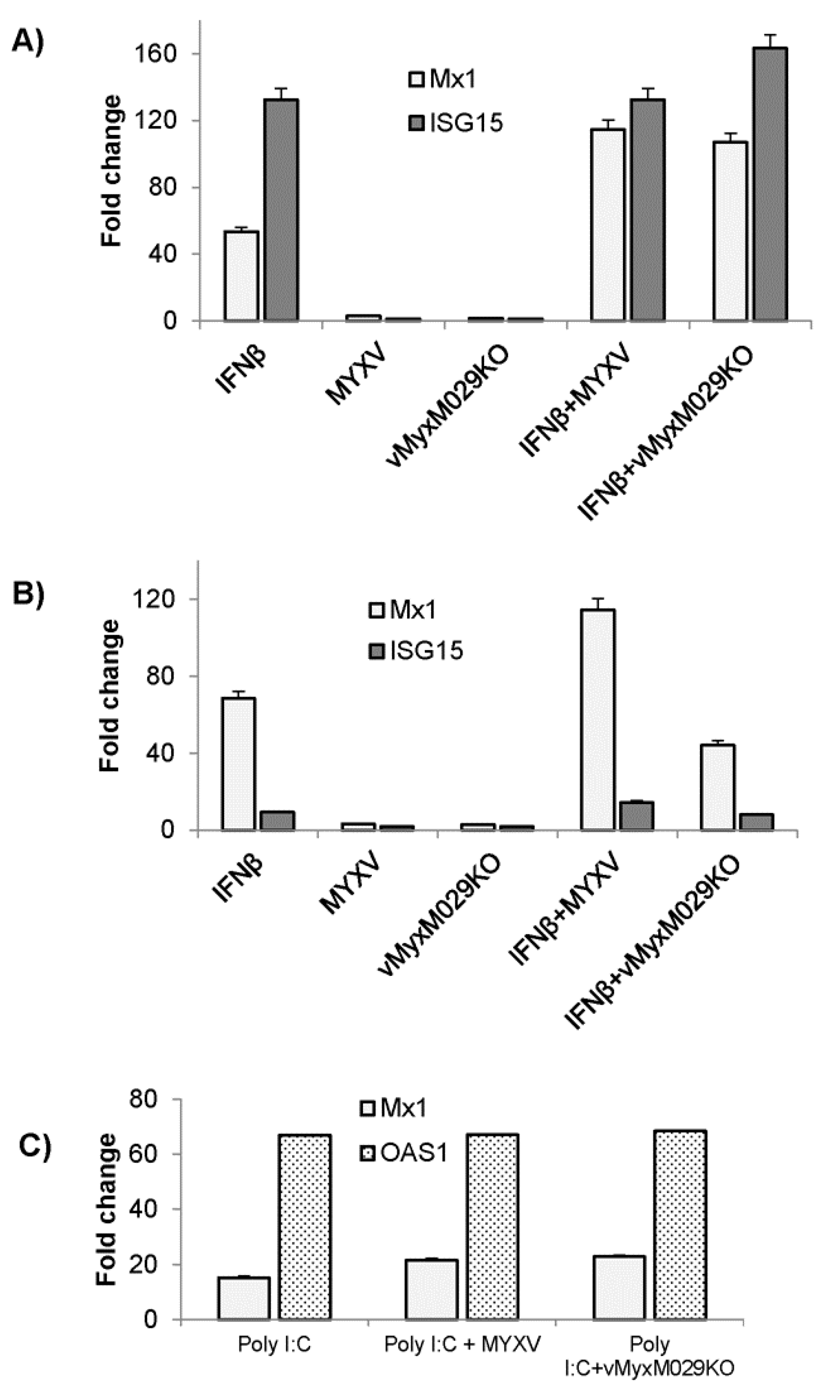 The next step was to check whether the failure of M029-minus virus to replicate in IFN-treated rabbit cells, and in PKR-deficient permissive human or mouse cells, can be explained by virus-induced changes in the levels of ISG proteins. The induction of antiviral ISGs, for example Mx1, ISG15, and OAS1 in response to IFN treatment was assessed in rabbit, human and mouse cells. Significantly increased ISG expression levels after IFN treatment were detected in human (HeLa) and mouse (MEF) cells, however, the upregulation of ISGs were relatively less robust in rabbit (RK13) cells in response to human or rabbit IFN treatment alone (Figure 8A,B, and not shown). However, transfection of poly I:C significantly enhanced the levels of induced expression of these ISGs in RK13 cells, which did not affect the WT-MYXV replication under these conditions (Figure 8C, and not shown). To test whether these levels of expressed ISGs were altered after WT-MYXV or vMyxM029KO virus infection, the cells were pre-treated with IFN or transfected with poly I:C (RK13 cells) and then infected with the test viruses. Measuring the levels of ISG RNAs by qPCR indicate that both the WT-MYXV and vMyxM029KO viruses were unable to alter the tested ISG mRNA levels in HeLa, MEF or RK13 (or by MYXV and M029KO virus alone) cell lines when the IFN is added prior to the virus. We also observed that infection with either virus alone did not enhance the transcription of any tested ISGs. These results suggest that neither WT-MYXV nor M029-minus virus alters the levels of pre-existing ISG that mediate the antiviral state in IFN pre-treated cells of any of the three species that were tested. We have also transiently expressed M029 alone in human cells and observed no inhibition in the levels of IFN-induced expression of tested ISGs (data not shown). In addition, we have not observed any effects on the IFN-induced expression of selective ISGs at the translational level in HeLa cells (data not shown). Collectively, these data indicate that the inability of M029-minus MYXV to replicate in human or mouse cells is not due to any inability to alter pre-expressed ISGs that mediate the antiviral state.
