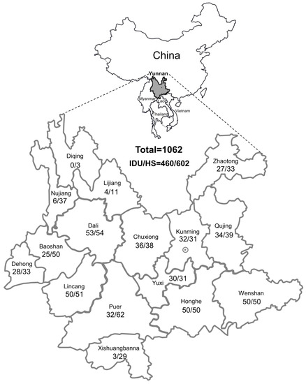 - Chen, M.; Ma, Y.; Chen, H.; Luo, H.; Dai, J.; Song, L.; Yang, C.; Mei, J.; Yang, L.; Dong, L.; et al. Multiple introduction and naturally occuring drug resistance of HCV among HIV-infected intravenous drug users in Yunnan: An origin of China’s HIV/HCV epidemics. PLoS ONE 2015, 10, e0142543. [Google Scholar] [CrossRef] [PubMed]