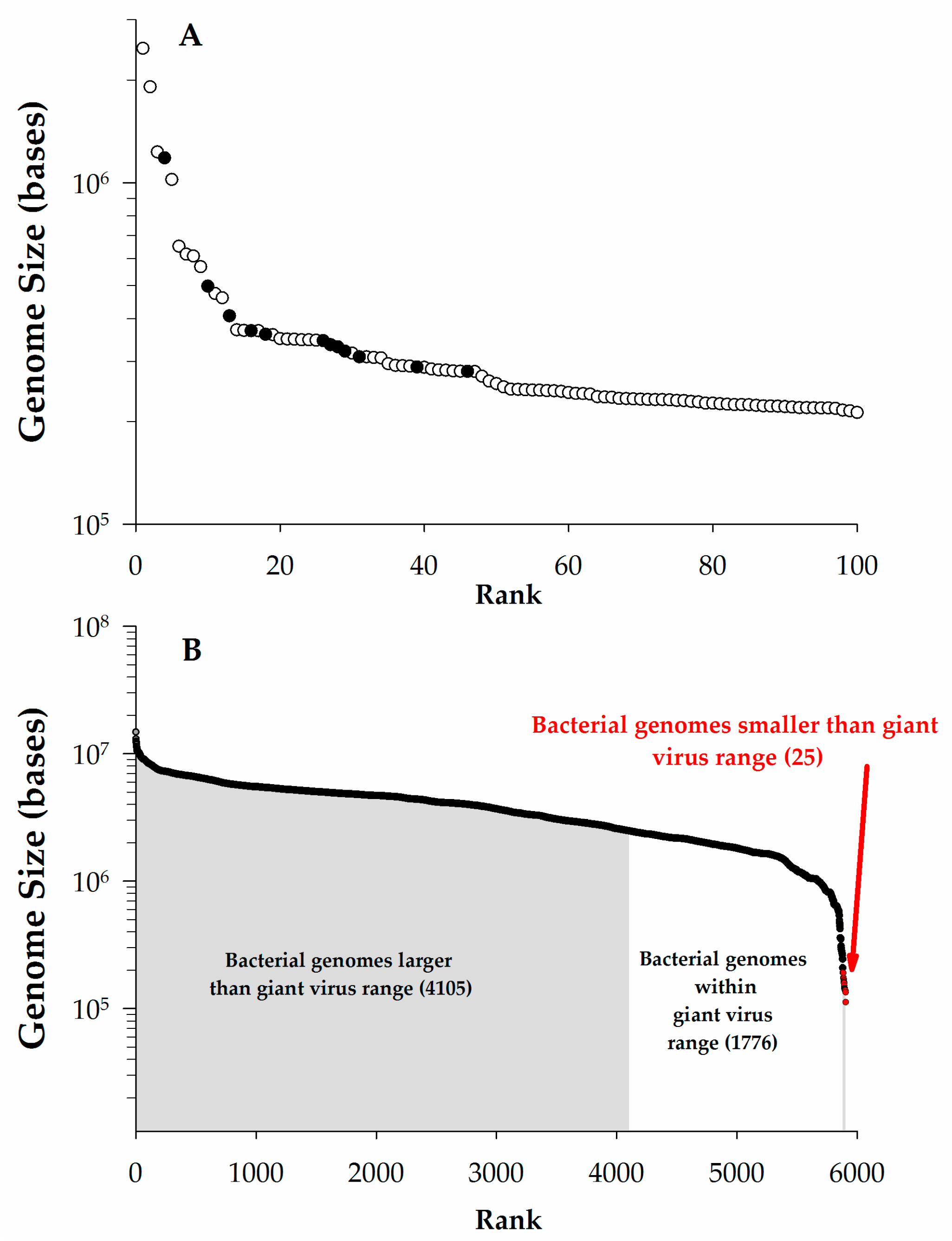 The scale of giant virus genomes. (A). Genome size vs. rank plot for the largest 100 complete viral genomes as of January 2016 from National Center for Biotechnology Information (NCBI). Data points noted (●) were previously used in discussion by Claverie et al. [3] to define giants viruses as having genomes > 280 kb, open circles (○) represent additional data; (B). Genome size vs. rank order of completed bacterial genomes in NCBI as of January 2016. Sizes are color-coded to match the ranges of giant virus genomes.