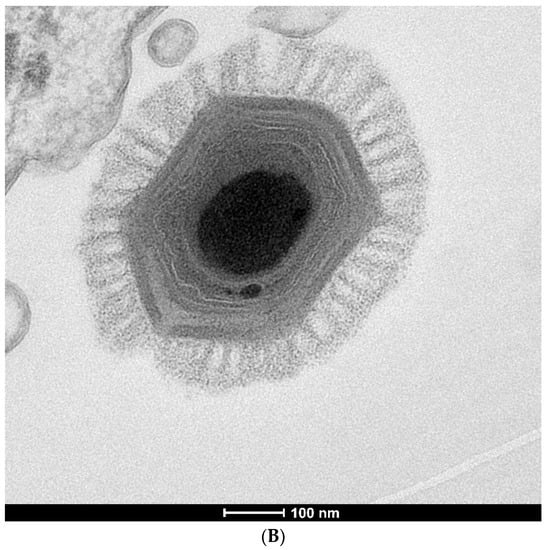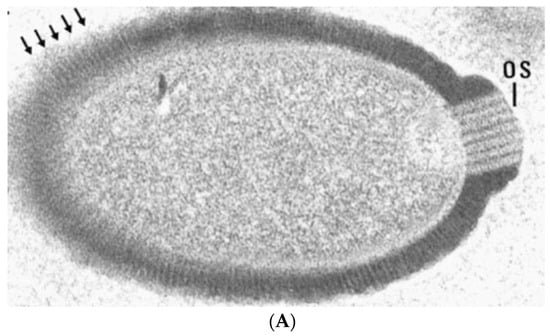 Transmission electron micrographs of giant virus particles. (A) Pithovirus, as seen in Michel et al. [22]. Originally identified as a KC5/2 parasite, the image shows the electron dense viral wall consisting of perpendicularly oriented fibers or microtubules (arrows), and a marked ostiole (os) located at the apical end of the cell. Reprinted with permission—original magnification at 85,000×; (B) Megavirus chilensis. Image courtesy of Professors Chantal Abergel and Jean-Michel Claverie.