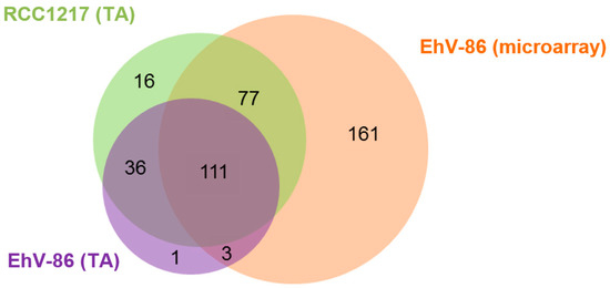 Venn diagram illustrating the comparative Emiliania huxleyi virus (EhV) coding sequence (CDS) expression in different strains and between treatments. In green, RCC1217 (1N) complementary cDNA (cDNA) hybridised onto a CCMP1516 + EhV-86 tiling array (TA) (this study). In purple CCMP1516 + EhV-86 3.5 h post infection cDNA hybridised onto the TA (this study). In orange, CCMP1516 EhV-86 cDNA hybridised onto conventional microarrays [10,29].