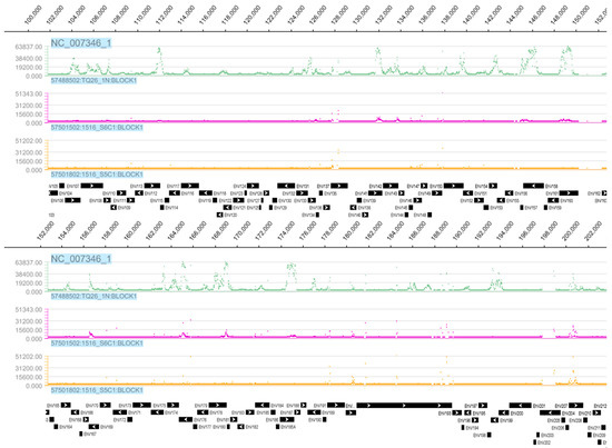 The EhV-86 TA revealed the strong expression of EhV transcripts in an uninoculated culture of the haploid RCC1217 (Figure 1 and Figure 2, Table S1). The detection of EhV transcripts expressed by the RCC1217 (1N) cells brings the total number expressed up to 85.9% (405 of a total 472). Uninfected cultures of diploid CCMP1516 and RCC1216 confirmed the specificity of the hybridization conditions (Figure 2), only showing small areas of non-specific hybridization, likely due to genes shared between the host and virus which are a result of horizontal gene transfer [30].